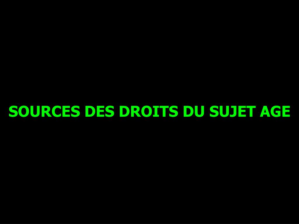 Sources des Droits du sujet âgé Déclaration Universelle des Droits de l’Homme Serment d’Hippocrate Chartes, Codes des Professions de Santé, Déclarations…