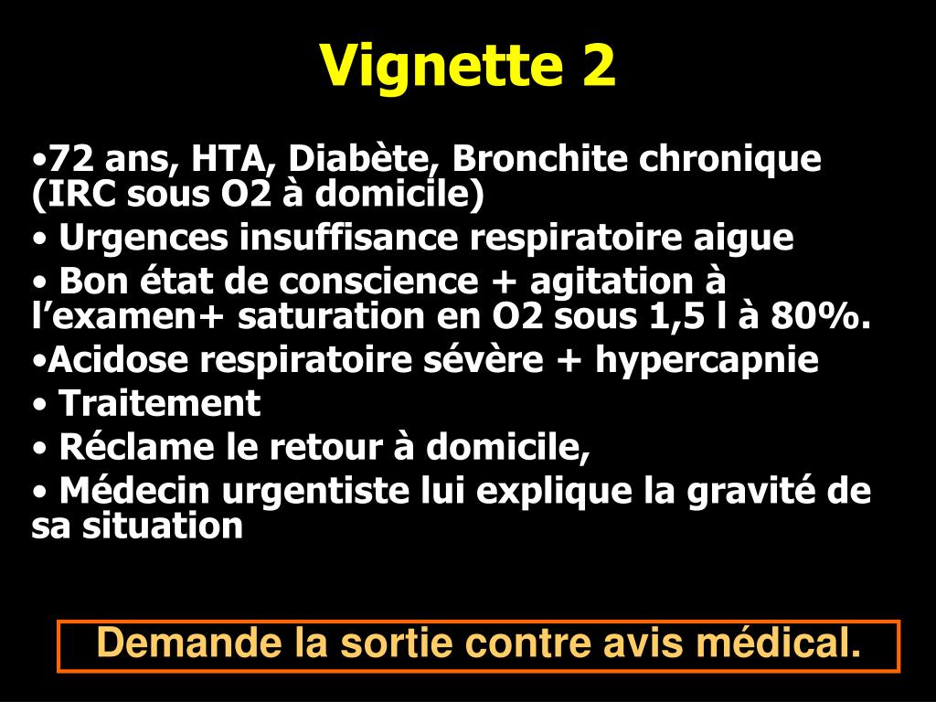 Vignette 2 • 72 ans, HTA, Diabète, Bronchite chronique (IRC sous O2 à domicile) • Urgences insuffisance respiratoire aigue • Bon état de conscience + agitation à l’examen+ saturation en O2 sous 1,5 l à 80%. • Acidose respiratoire sévère + hypercapnie • Traitement • Réclame le retour à domicile, • Médecin urgentiste lui explique la gravité de sa situation Demande la sortie contre avis médical.