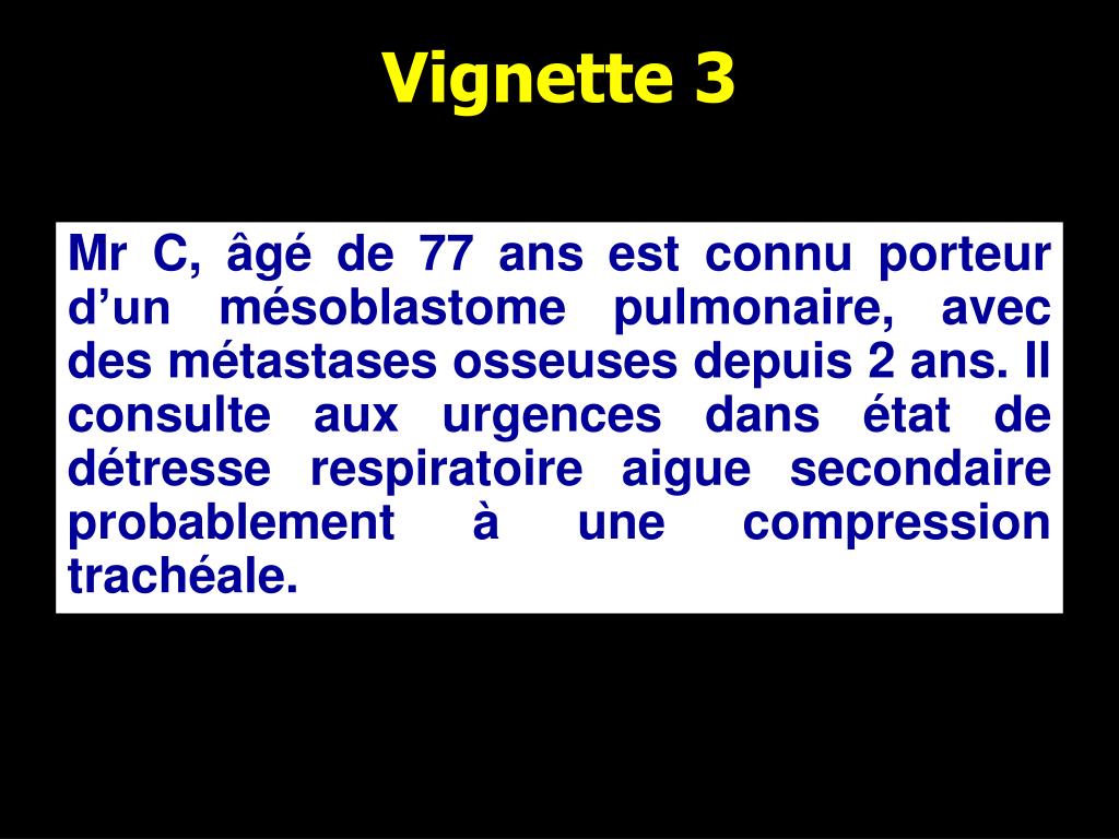 Vignette 3 Mr C, âgé de 77 ans est connu porteur d’un mésoblastome pulmonaire, avec des métastases osseuses depuis 2 ans. Il consulte aux urgences dans état de détresse respiratoire aigue secondaire probablement à une compression trachéale.