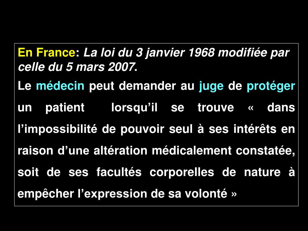 En France: La loi du 3 janvier 1968 modifiée par celle du 5 mars 2007. Le médecin peut demander au juge de protéger un patient lorsqu’il se trouve « dans l’impossibilité de pouvoir seul à ses intérêts en raison d’une altération médicalement constatée, soit de ses facultés corporelles de nature à empêcher l’expression de sa volonté »