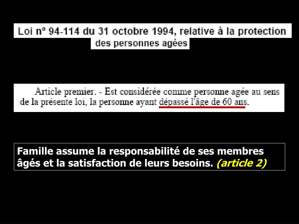 Famille assume la responsabilité de ses membres âgés et la satisfaction de leurs besoins. (article 2)