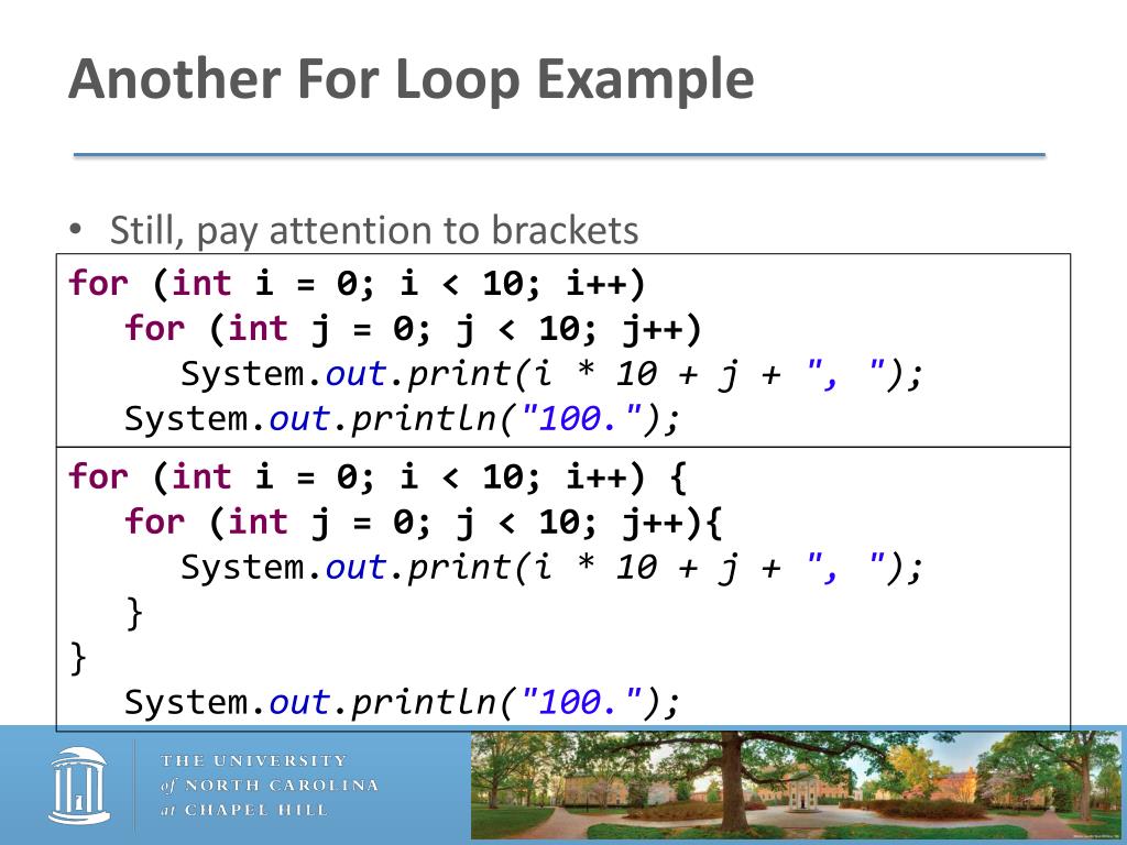 Another For Loop Example • Still, pay attention to brackets for (int i = 0; i < 10; i++) for (int j = 0; j < 10; j++) System.out.print(i * 10 + j + ", "); System.out.println("100."); for (int i = 0; i < 10; i++) { for (int j = 0; j < 10; j++){ System.out.print(i * 10 + j + ", "); } } System.out.println("100.");