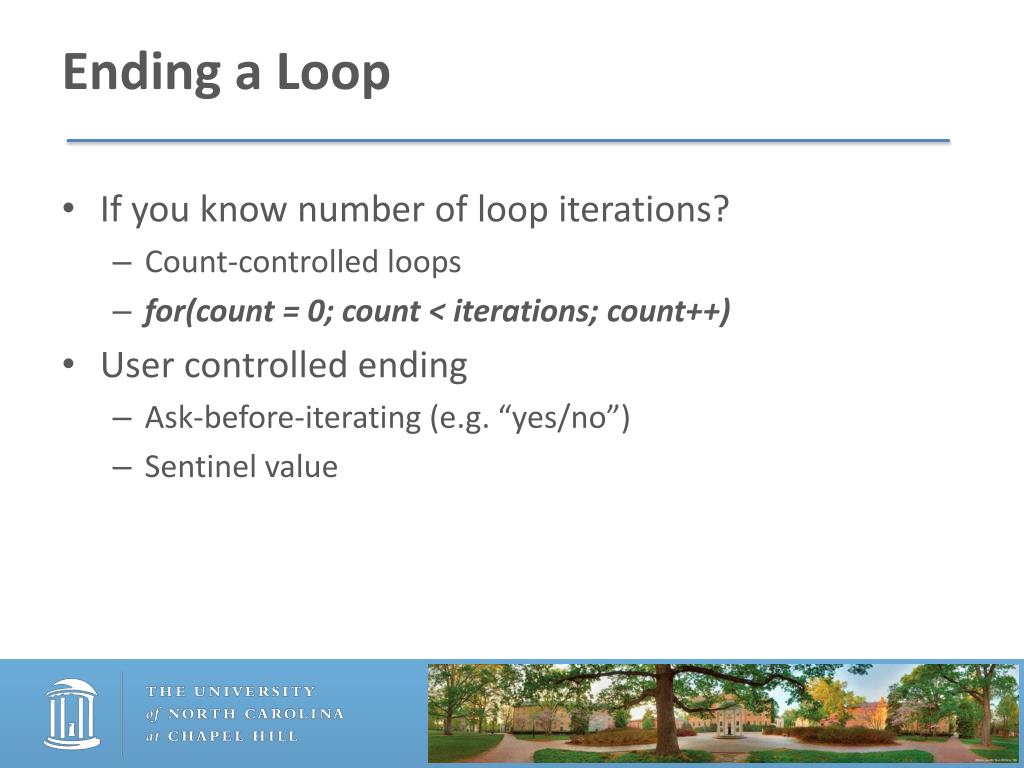 Ending a Loop • If you know number of loop iterations? • Count-controlled loops • for(count = 0; count < iterations; count++) • User controlled ending • Ask-before-iterating (e.g. “yes/no”) • Sentinel value
