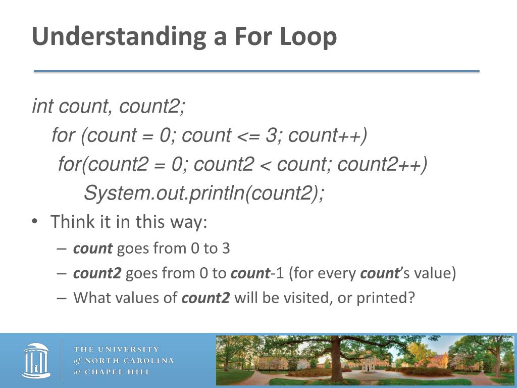 What is the Output? int count, count2; for (count = 0; count <= 3; count++) for(count2 = 0; count2 < count; count2++) System.out.println(count2); 1 0 2 3 Count = 4 Output will be 0, 0, 1, 0, 1, 2 Count2 = Intuition: exhaustively list all possibilities 3 0 1 2