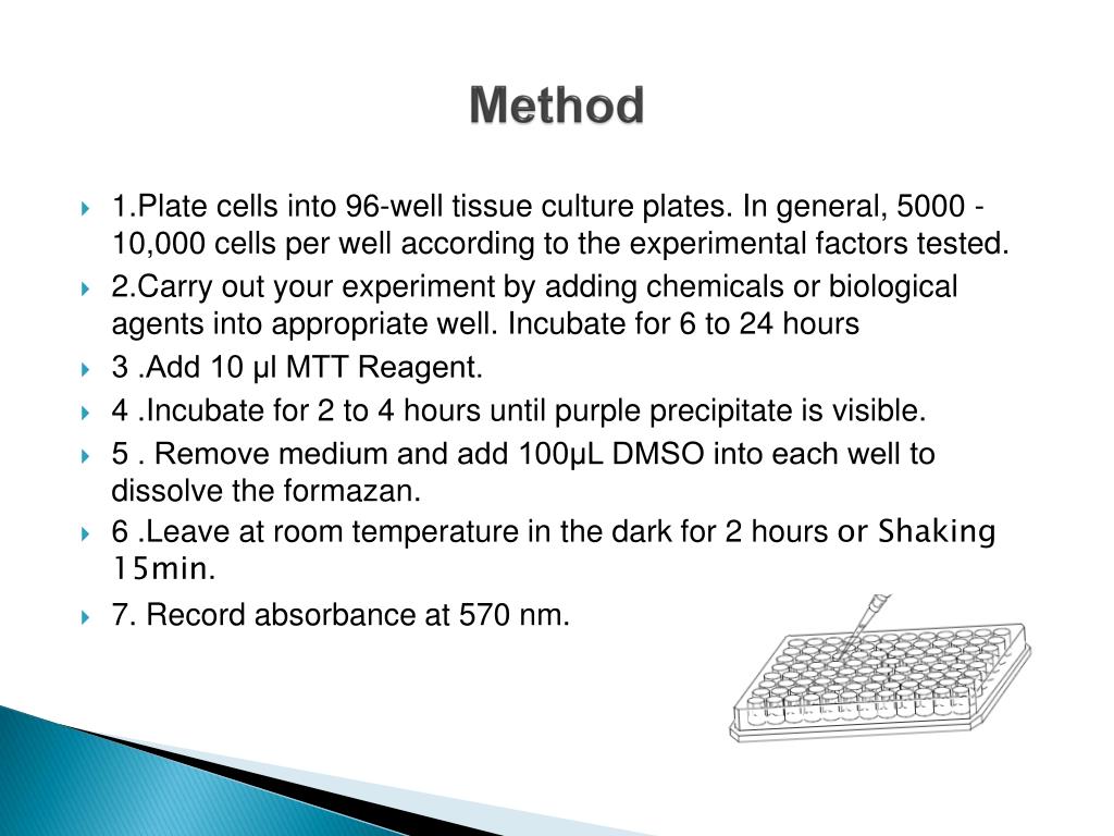 Method • 1.Plate cells into 96-well tissue culture plates. In general, 5000 -10,000 cells per well according to the experimental factors tested. • 2.Carry out your experiment by adding chemicals or biological agents into appropriate well. Incubate for 6 to 24 hours • 3 .Add 10 μl MTT Reagent. • 4 .Incubate for 2 to 4 hours until purple precipitate is visible. • 5 . Remove medium and add 100μL DMSO into each well to dissolve the formazan. • 6 .Leave at room temperature in the dark for 2 hours or Shaking 15min. • 7. Record absorbance at 570 nm.