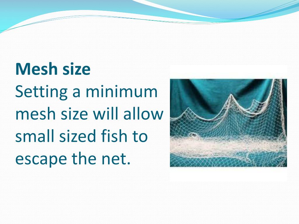 Mesh sizeSetting a minimum mesh size will allow small sized fish toescape the net.