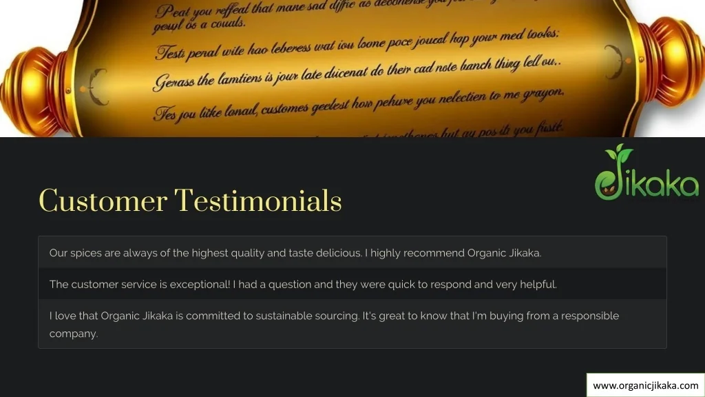 Customer Testimonials Our spices are always of the highest quality and taste delicious. I highly recommend Organic Jikaka. The customer service is exceptional! I had a question and they were quick to respond and very helpful. I love that Organic Jikaka is committed to sustainable sourcing. It's great to know that I'm buying from a responsible company. www.organicjikaka.com