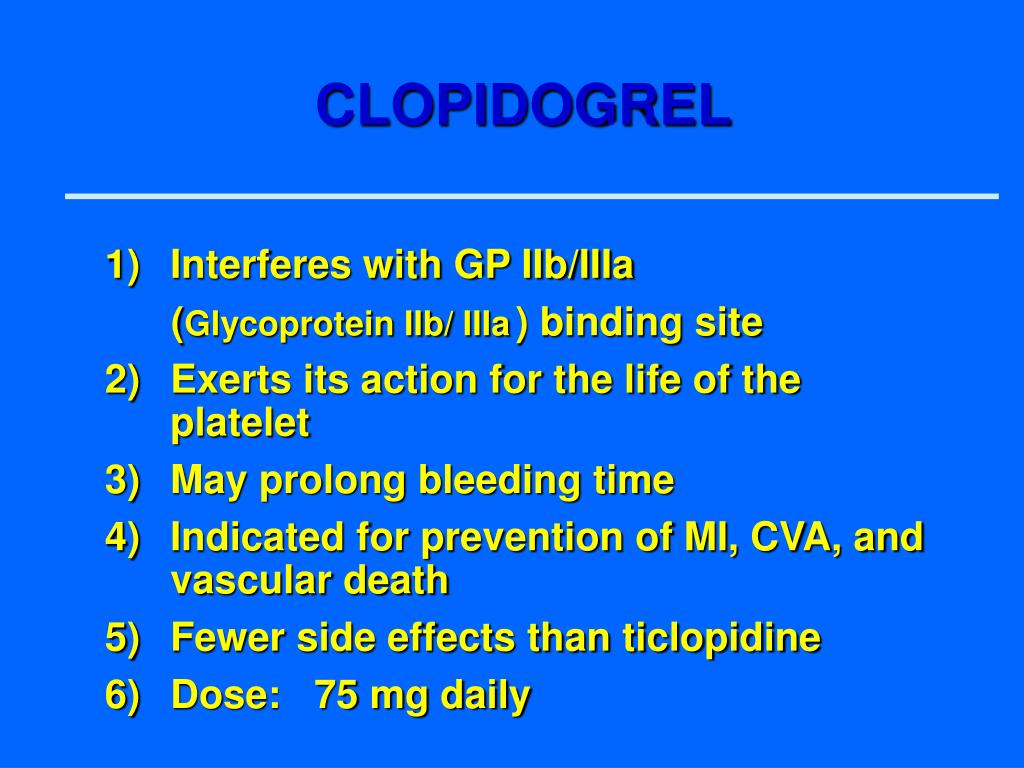 CLOPIDOGREL • Interferes with GP IIb/IIIa • (Glycoprotein IIb/ IIIa) binding site • 2) Exerts its action for the life of the platelet • 3) May prolong bleeding time • 4) Indicated for prevention of MI, CVA, and vascular death • 5) Fewer side effects than ticlopidine • 6) Dose: 75 mg daily