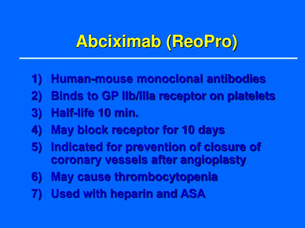 Abciximab (ReoPro) • Human-mouse monoclonal antibodies • Binds to GP IIb/IIIa receptor on platelets • Half-life 10 min. • May block receptor for 10 days • Indicated for prevention of closure of coronary vessels after angioplasty • May cause thrombocytopenia • Used with heparin and ASA