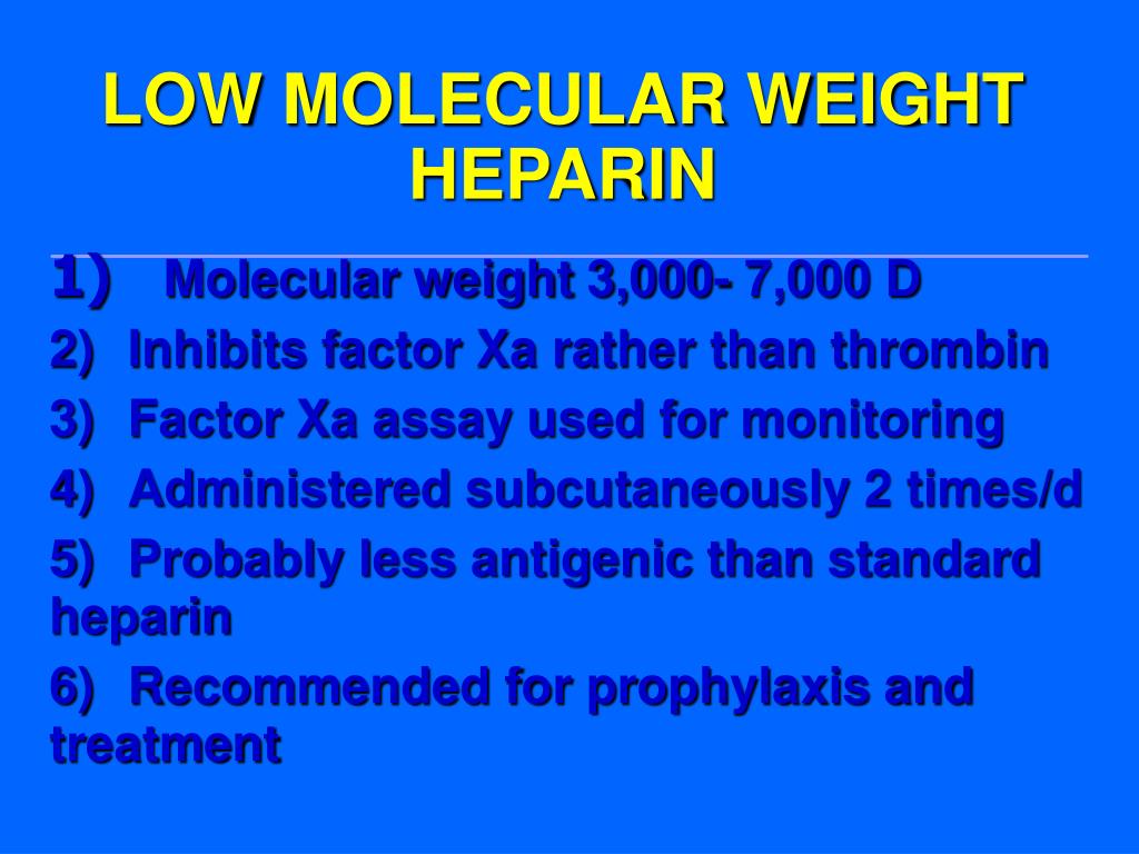 LOW MOLECULAR WEIGHT HEPARIN 1) Molecular weight 3,000- 7,000 D 2) Inhibits factor Xa rather than thrombin 3) Factor Xa assay used for monitoring 4) Administered subcutaneously 2 times/d 5) Probably less antigenic than standard heparin 6) Recommended for prophylaxis and treatment
