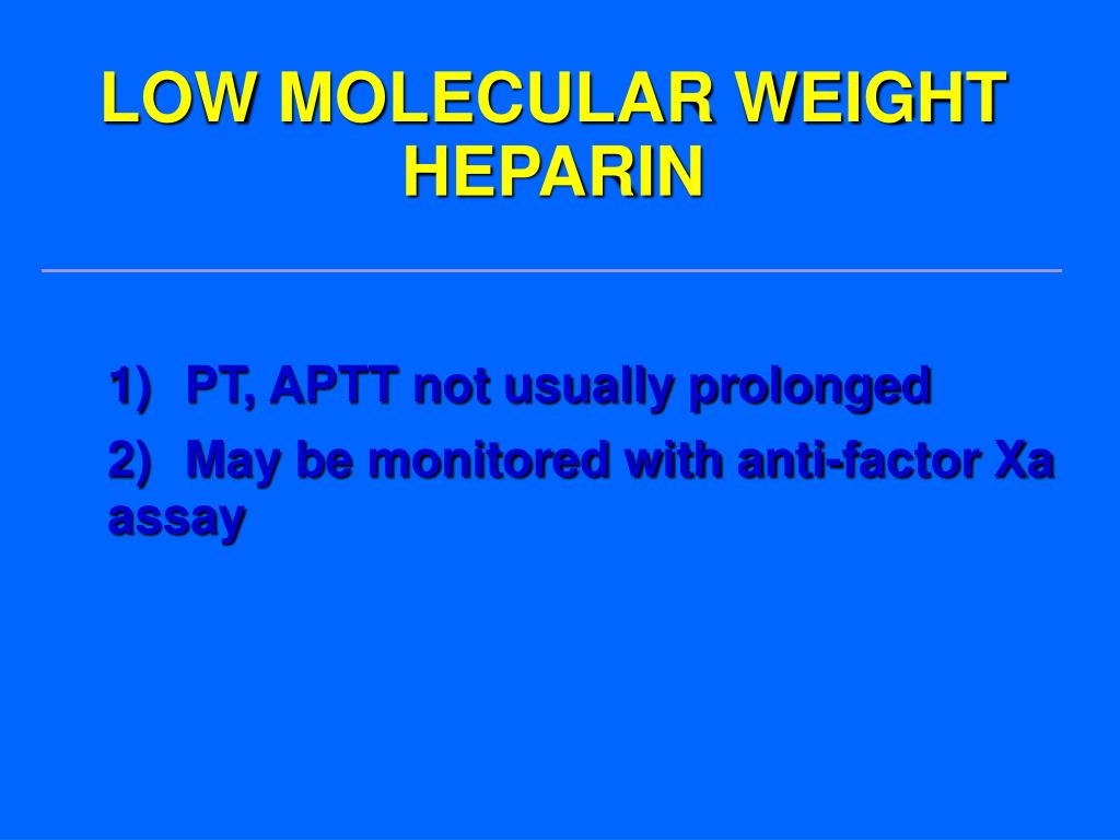 LOW MOLECULAR WEIGHT HEPARIN 1) PT, APTT not usually prolonged 2) May be monitored with anti-factor Xa assay