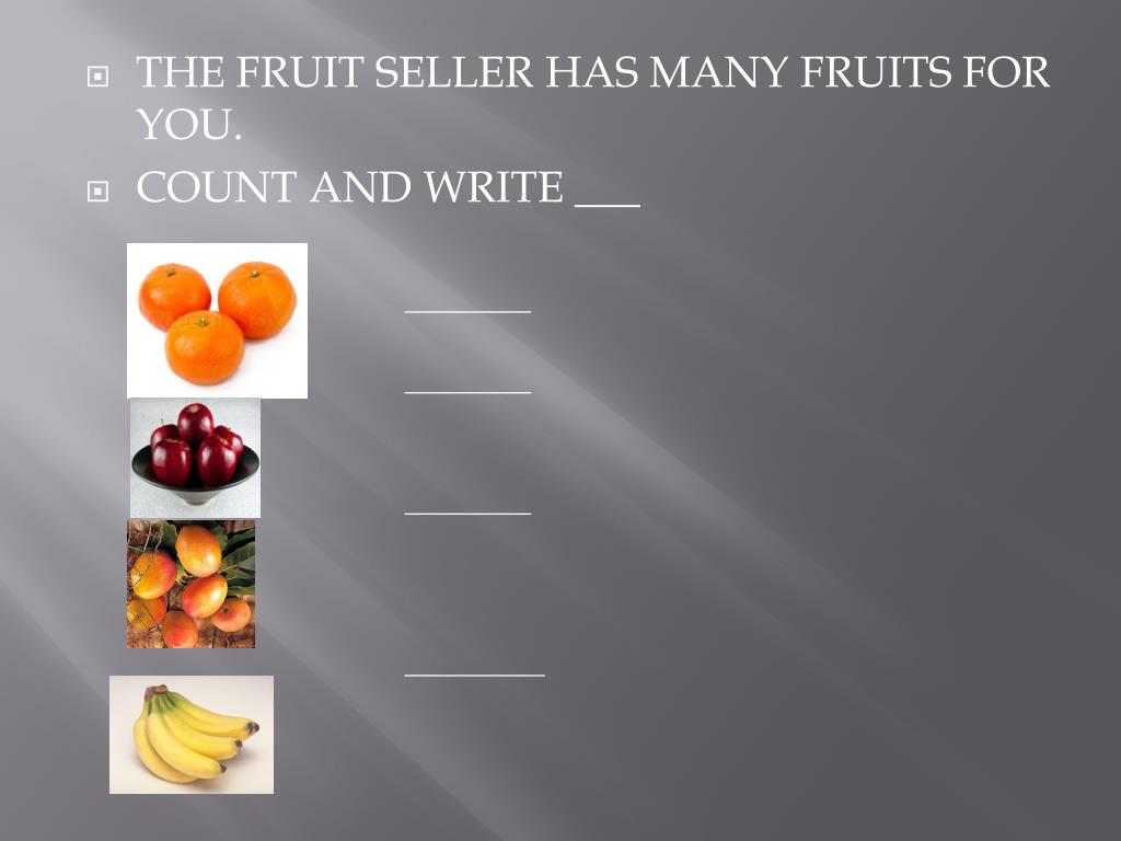 THE FRUIT SELLER HAS MANY FRUITS FOR YOU. • COUNT AND WRITE ___ _________ _________ _________ __________
