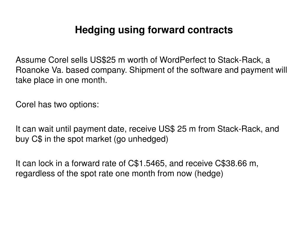 Hedging using forward contracts Assume Corel sells US$25 m worth of WordPerfect to Stack-Rack, a Roanoke Va. based company. Shipment of the software and payment will take place in one month. Corel has two options: It can wait until payment date, receive US$ 25 m from Stack-Rack, and buy C$ in the spot market (go unhedged) It can lock in a forward rate of C$1.5465, and receive C$38.66 m, regardless of the spot rate one month from now (hedge)
