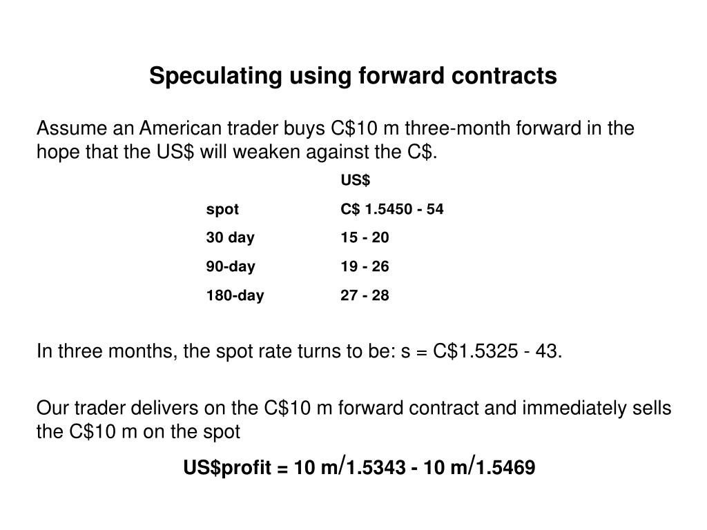 Speculating using forward contracts Assume an American trader buys C$10 m three-month forward in the hope that the US$ will weaken against the C$. In three months, the spot rate turns to be: s = C$1.5325 - 43. Our trader delivers on the C$10 m forward contract and immediately sells the C$10 m on the spot US$profit = 10 m/1.5343 - 10 m/1.5469