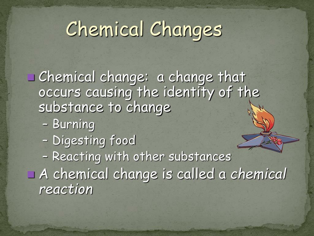 Chemical Changes • Chemical change: a change that occurs causing the identity of the substance to change • Burning • Digesting food • Reacting with other substances • A chemical change is called a chemical reaction