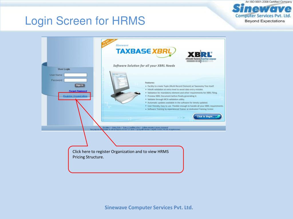 Login Screen for HRMS Click here to register Organization and to view HRMS Pricing Structure. Sinewave Computer Services Pvt. Ltd.