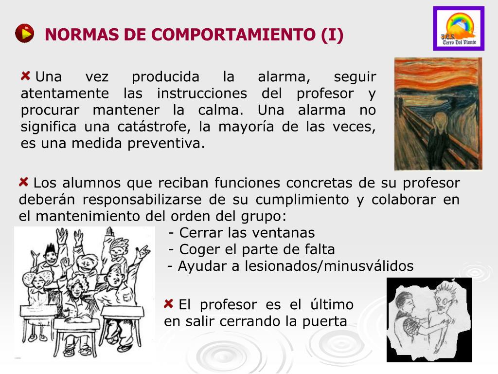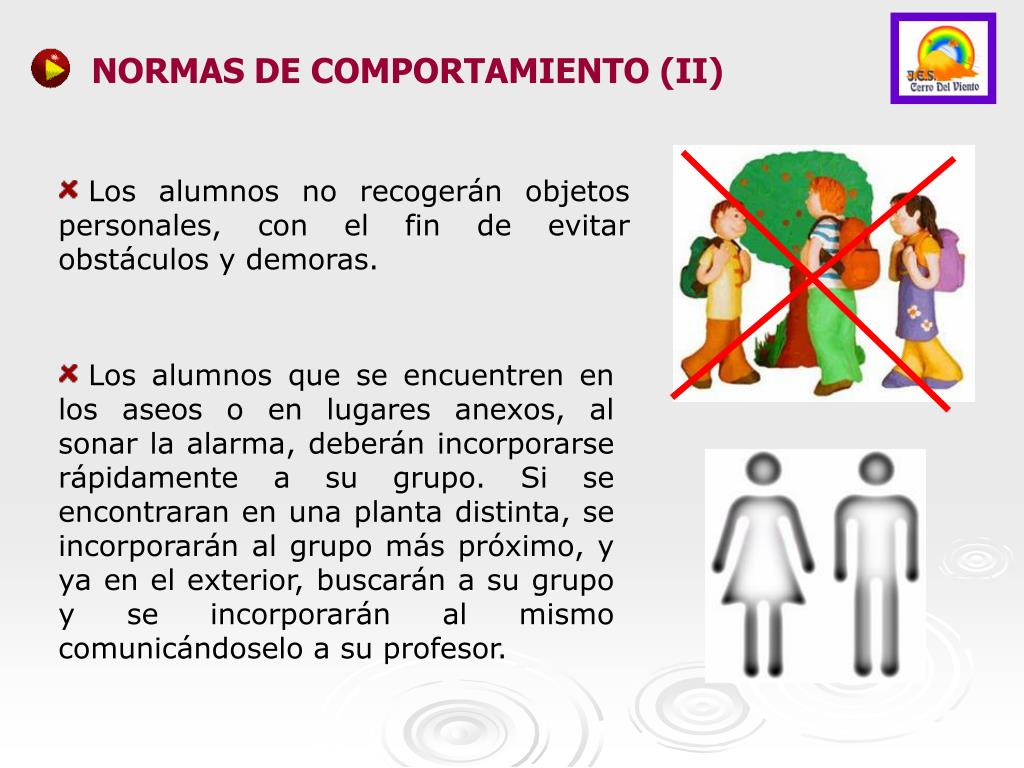 NORMAS DE COMPORTAMIENTO (II) • Los alumnos no recogerán objetos personales, con el fin de evitar obstáculos y demoras. • Los alumnos que se encuentren en los aseos o en lugares anexos, al sonar la alarma, deberán incorporarse rápidamente a su grupo. Si se encontraran en una planta distinta, se incorporarán al grupo más próximo, y ya en el exterior, buscarán a su grupo y se incorporarán al mismo comunicándoselo a su profesor.
