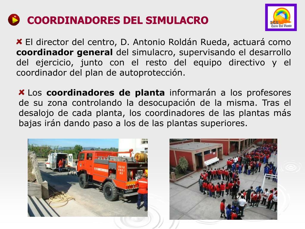 COORDINADORES DEL SIMULACRO COORDINADORES DEL SIMULACRO • El director del centro, D. Antonio Roldán Rueda, actuará como coordinador general del simulacro, supervisando el desarrollo del ejercicio, junto con el resto del equipo directivo y el coordinador del plan de autoprotección. • Los coordinadores de planta informarán a los profesores de su zona controlando la desocupación de la misma. Tras el desalojo de cada planta, los coordinadores de las plantas más bajas irán dando paso a los de las plantas superiores.