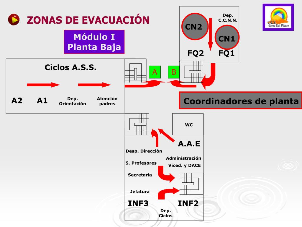 Coordinadores de planta Dep. C.C.N.N. ZONAS DE EVACUACIÓN CN2 Módulo I Planta Baja CN1 FQ2 FQ1 Ciclos A.S.S. A B A2 A1 Dep. Orientación Atención padres WC A.A.E Desp. Dirección Administración S. Profesores Viced. y DACE Secretaría Jefatura INF3 INF2 Dep. Ciclos