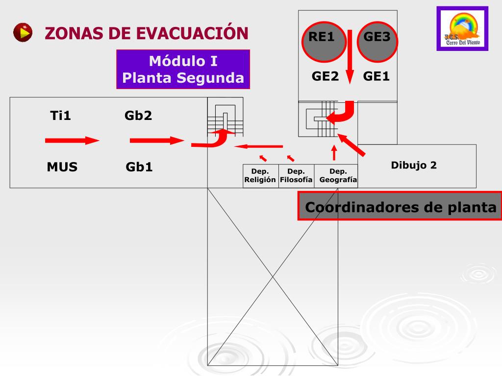 Coordinadores de planta ZONAS DE EVACUACIÓN RE1 GE3 Módulo I Planta Segunda GE2 GE1 Ti1 Gb2 MUS Gb1 Dibujo 2 Dep. Religión Dep. Filosofía Dep. Geografía