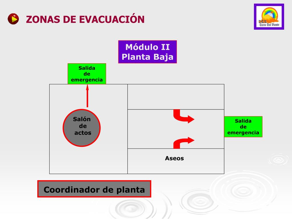 Coordinador de planta ZONAS DE EVACUACIÓN Módulo II Planta Baja Salida de emergencia Salón de actos Salida de emergencia Aseos