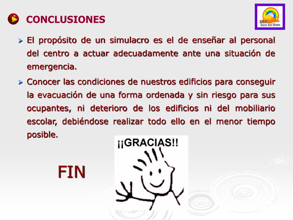 FIN CONCLUSIONES • El propósito de un simulacro es el de enseñar al personal del centro a actuar adecuadamente ante una situación de emergencia. • Conocer las condiciones de nuestros edificios para conseguir la evacuación de una forma ordenada y sin riesgo para sus ocupantes, ni deterioro de los edificios ni del mobiliario escolar, debiéndose realizar todo ello en el menor tiempo posible.