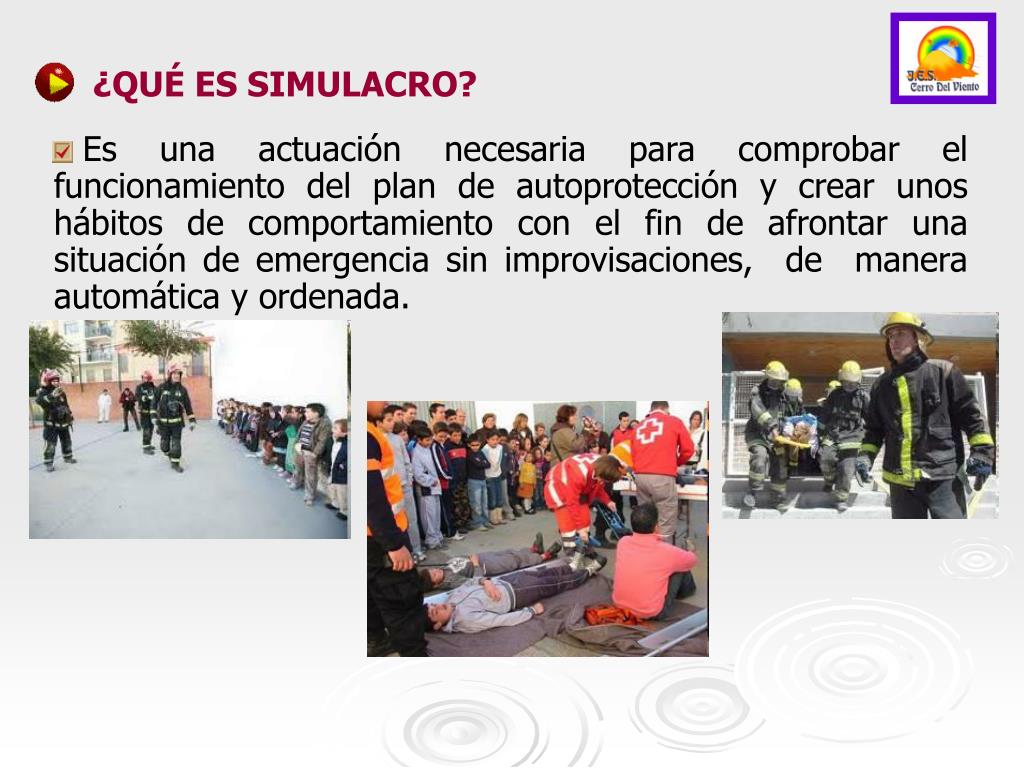 ¿QUÉ ES SIMULACRO? Es una actuación necesaria para comprobar el funcionamiento del plan de autoprotección y crear unos hábitos de comportamiento con el fin de afrontar una situación de emergencia sin improvisaciones, de manera automática y ordenada.