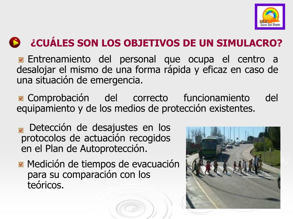 ¿CUÁLES SON LOS OBJETIVOS DE UN SIMULACRO? Entrenamiento del personal que ocupa el centro a desalojar el mismo de una forma rápida y eficaz en caso de una situación de emergencia. Comprobación del correcto funcionamiento del equipamiento y de los medios de protección existentes. Detección de desajustes en los protocolos de actuación recogidos en el Plan de Autoprotección. Medición de tiempos de evacuaciónpara su comparación con los teóricos.