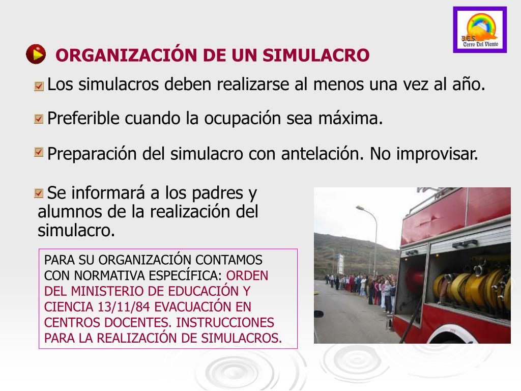 ORGANIZACIÓN DE UN SIMULACRO Los simulacros deben realizarse al menos una vez al año. Preferible cuando la ocupación sea máxima. Preparación del simulacro con antelación. No improvisar. Se informará a los padres y alumnos de la realización del simulacro. PARA SU ORGANIZACIÓN CONTAMOS CON NORMATIVA ESPECÍFICA: ORDEN DEL MINISTERIO DE EDUCACIÓN Y CIENCIA 13/11/84 EVACUACIÓN EN CENTROS DOCENTES. INSTRUCCIONES PARA LA REALIZACIÓN DE SIMULACROS.