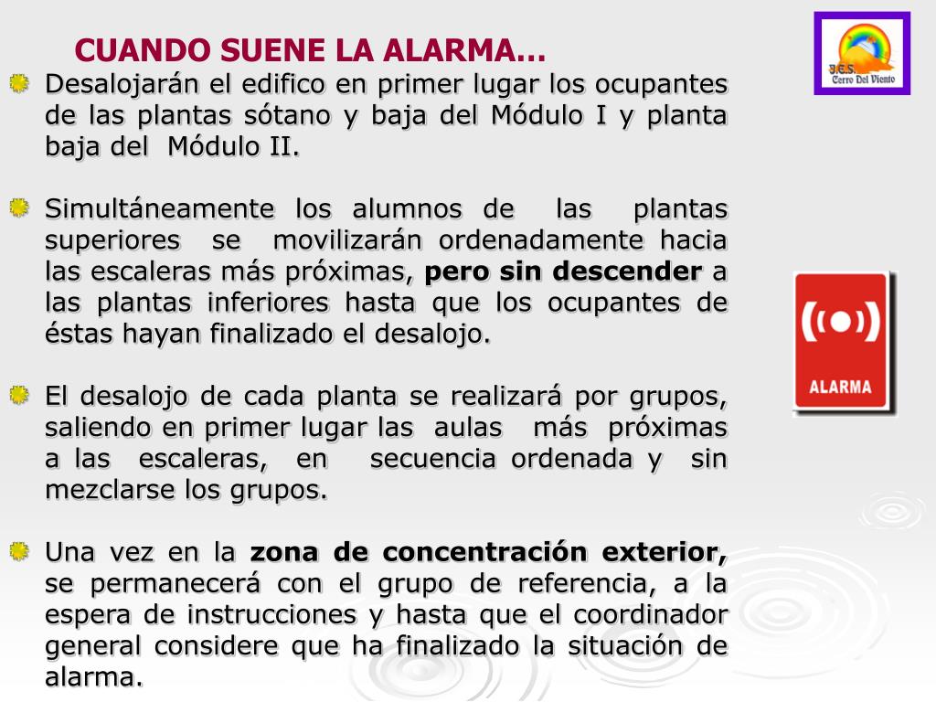 CUANDO SUENE LA ALARMA… • Desalojarán el edifico en primer lugar los ocupantes de las plantas sótano y baja del Módulo I y planta baja del Módulo II. • Simultáneamente los alumnos de las plantas superiores se movilizarán ordenadamente hacia las escaleras más próximas, pero sin descender a las plantas inferiores hasta que los ocupantes de éstas hayan finalizado el desalojo. • El desalojo de cada planta se realizará por grupos, saliendo en primer lugar las aulas más próximas a las escaleras, en secuencia ordenada y sin mezclarse los grupos. • Una vez en la zona de concentración exterior, se permanecerá con el grupo de referencia, a la espera de instrucciones y hasta que el coordinadorgeneral considere que ha finalizado la situación de alarma.