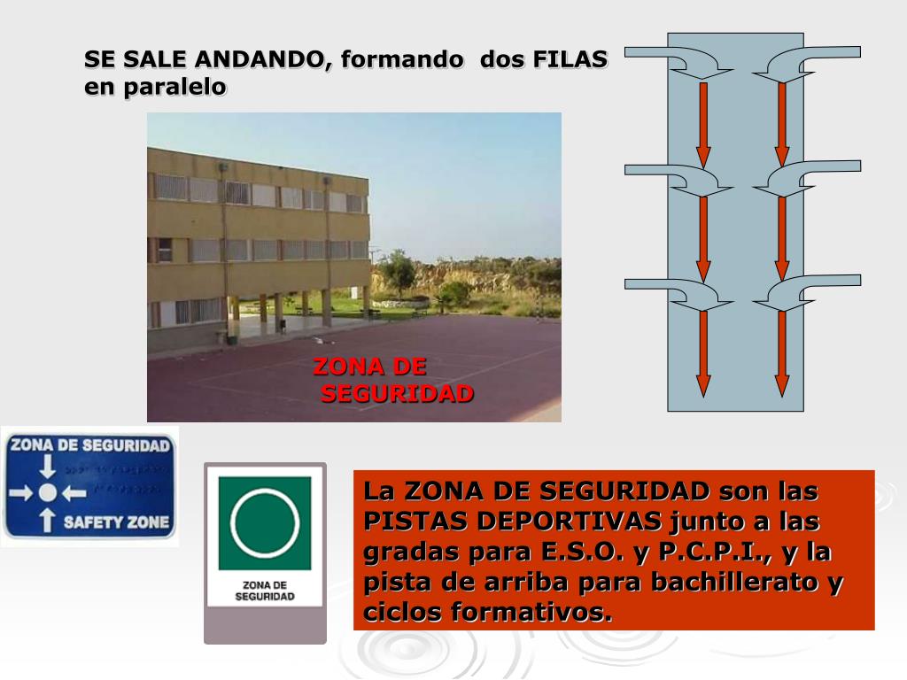 SE SALE ANDANDO, formando dos FILAS en paralelo ZONA DE SEGURIDAD La ZONA DE SEGURIDAD son las PISTAS DEPORTIVAS junto a las gradas para E.S.O. y P.C.P.I., y la pista de arriba para bachillerato y ciclos formativos.