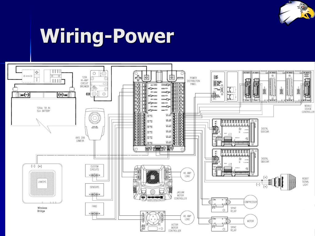 Power Distribution Panel (PD) • (8) 40A connectors • (12) 20/30A connectors • (2) Power-Safe Connections • 24V output for cRIO • 12V for WiFi • 5V for camera • Power input uses metric M6 nuts-don’t over torque • LEDs for 3 special connectors