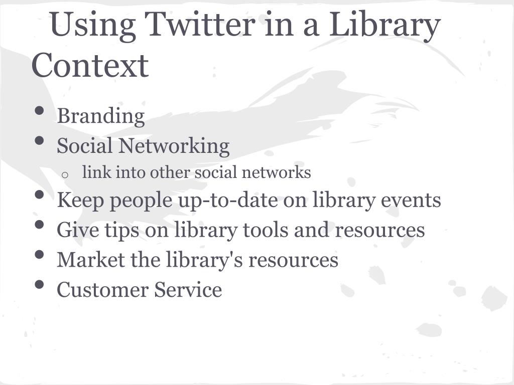Using Twitter in a Library Context • Branding • Social Networking • link into other social networks • Keep people up-to-date on library events • Give tips on library tools and resources • Market the library's resources • Customer Service