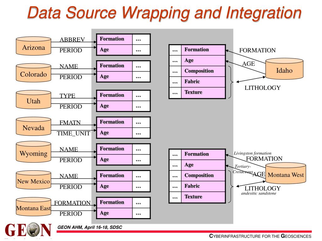 Data Source Wrapping and Integration ABBREV Arizona PERIOD FORMATION AGE Idaho NAME Colorado PERIOD LITHOLOGY Utah TYPE PERIOD Nevada FMATN TIME_UNIT Wyoming NAME Livingston formation FORMATION PERIOD Tertiary-Cretaceous Montana West AGE New Mexico NAME PERIOD LITHOLOGY andesitic sandstone Montana East FORMATION PERIOD