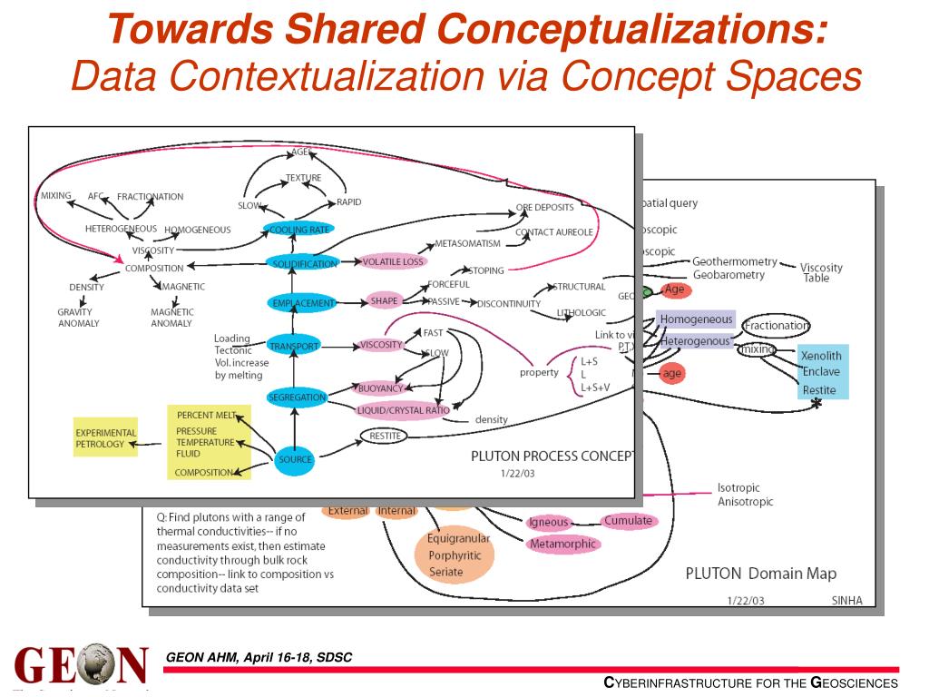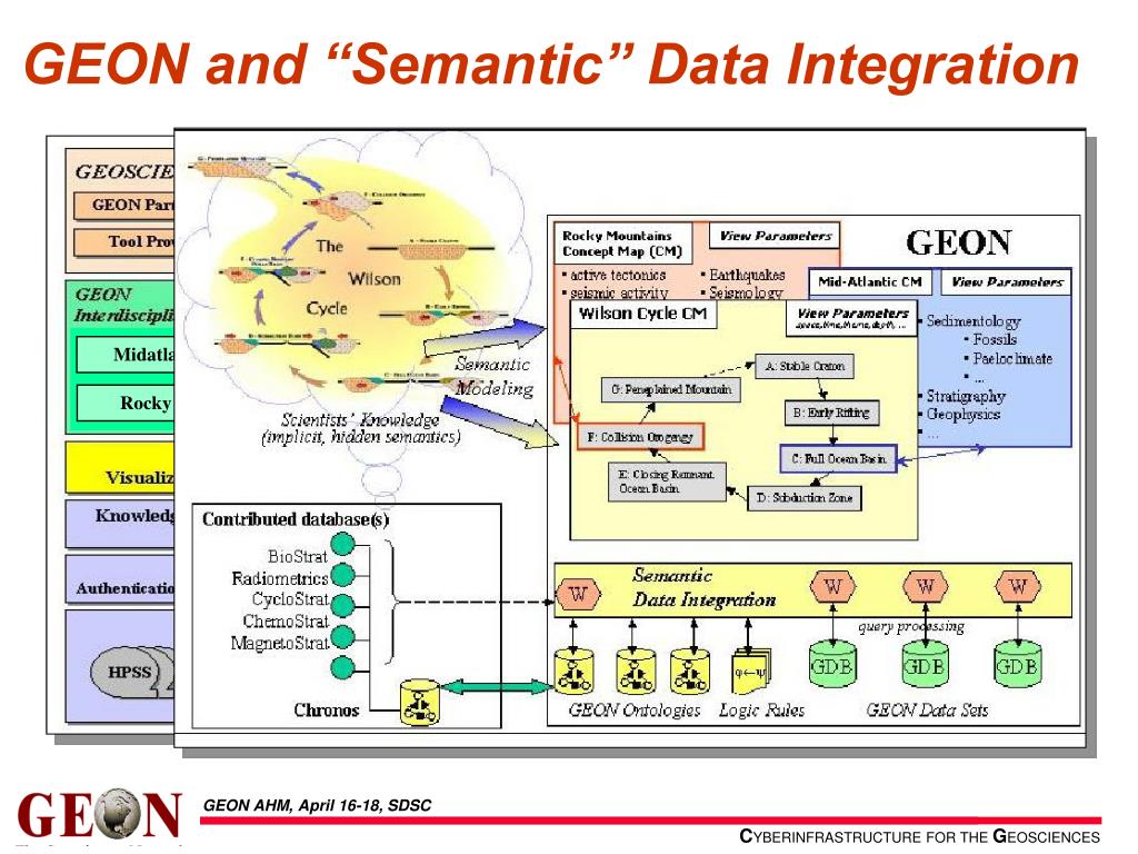GEON Framework for Interoperability in the Geosciences • Systems level: GEON Grid ... • enable sharing of data and tools via grid services • based on Open Grid Services Architecture (OGSA) • acquisition of cluster endpoints and initial deployment at some sites underway, including SDSC, UTEP, VT, ..., • Syntactic and schema level: Data integration via (meta)data standards (often XML-based) • database mediators create integrated virtual databases => dynamic creation and automatic update of data-warehouses • Semantic level: data integration via “semantic” mediation • Situating 4-D data in context spatio-temporal, thematic, processcontexts can be represented as “concept spaces” • specifically: use of ontologies, and logic-based knowledge representation • development guided/driven by specific scientific data integration problems