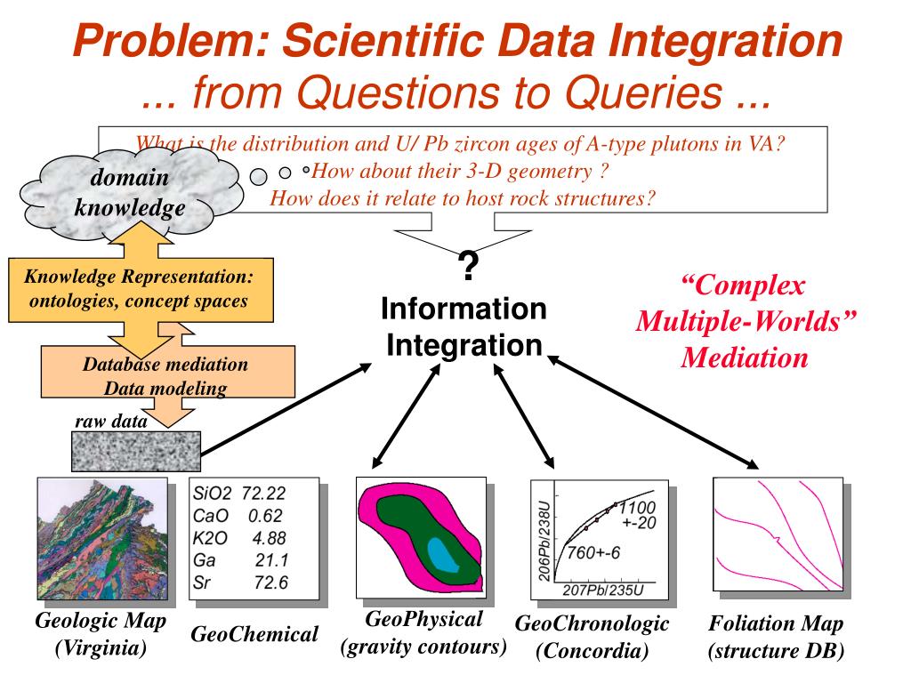 domain knowledge ? Information Integration Knowledge Representation: ontologies, concept spaces Database mediation Data modeling raw data Problem: Scientific Data Integration ... from Questions to Queries ... What is the distribution and U/ Pb zircon ages of A-type plutons in VA? How about their 3-D geometry ? How does it relate to host rock structures? “Complex Multiple-Worlds” Mediation GeoPhysical (gravity contours) Geologic Map (Virginia) GeoChronologic (Concordia) Foliation Map (structure DB) GeoChemical