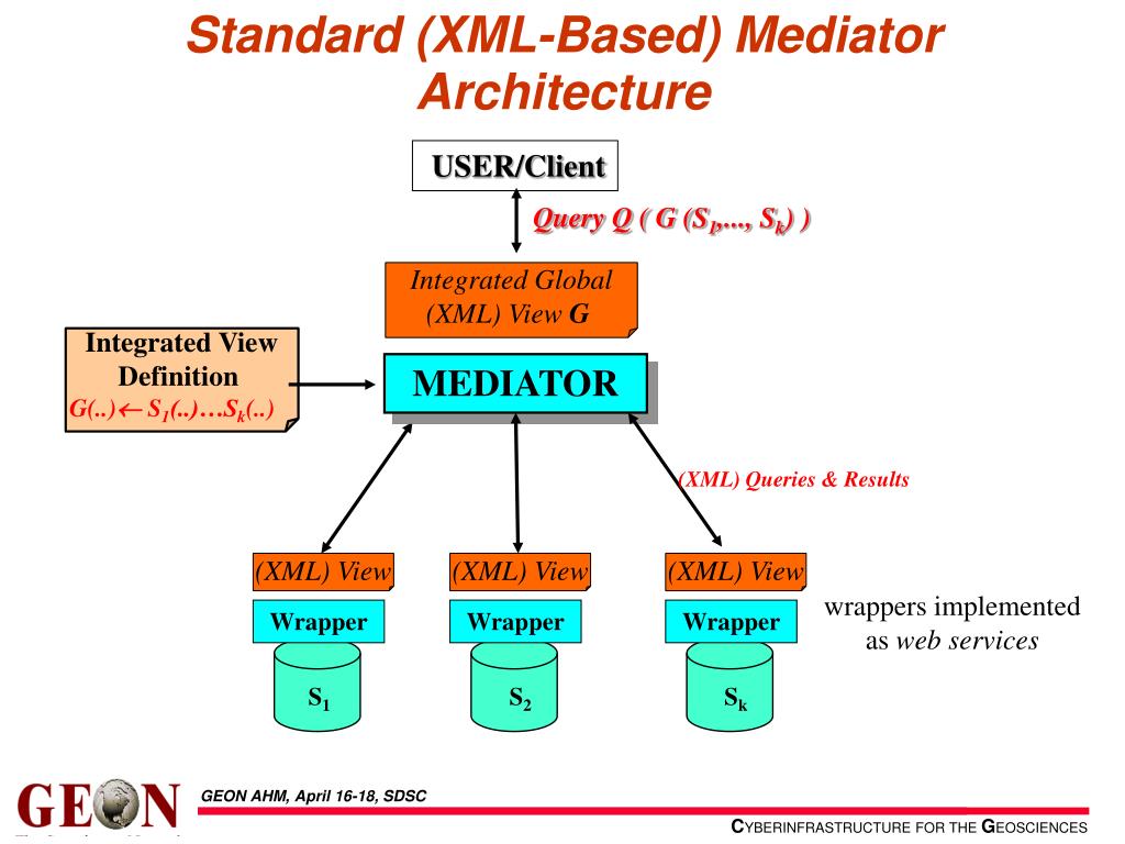 Standard (XML-Based) Mediator Architecture USER/Client Query Q ( G (S1,..., Sk) ) Integrated Global (XML) View G Integrated View Definition G(..) S1(..)…Sk(..) MEDIATOR (XML) Queries & Results (XML) View (XML) View (XML) View wrappers implemented as web services Wrapper Wrapper Wrapper S1 S2 Sk