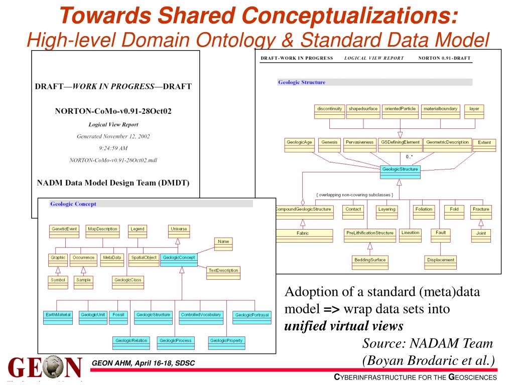 Towards Shared Conceptualizations: High-level Domain Ontology & Standard Data Model Adoption of a standard (meta)data model => wrap data sets into unified virtual views Source: NADAM Team (Boyan Brodaric et al.)