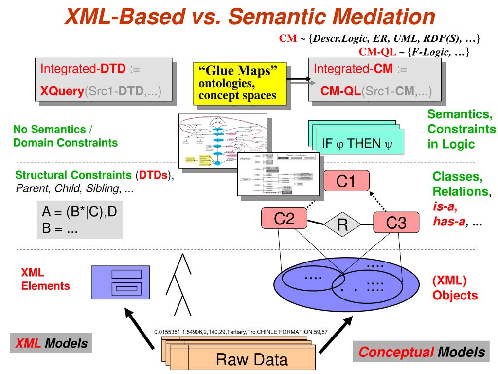 Integrated-DTD := XQuery(Src1-DTD,...) Integrated-CM := CM-QL(Src1-CM,...) “Glue Maps” ontologies, concept spaces Semantics, Constraints in Logic No Semantics / Domain Constraints IF THEN IF THEN IF THEN Structural Constraints (DTDs), Parent, Child, Sibling, ... Classes, Relations, is-a, has-a, ... C1 A = (B*|C),D B = ... C2 R C3 . . .... .... .... XML Elements .... (XML) Objects XMLModels Raw Data Raw Data ConceptualModels Raw Data XML-Based vs. Semantic Mediation CM ~ {Descr.Logic, ER, UML, RDF(S), …} CM-QL ~ {F-Logic, …} 0.0155381,1.54906,2,140,29,Tertiary,Trc,CHINLE FORMATION,59,57