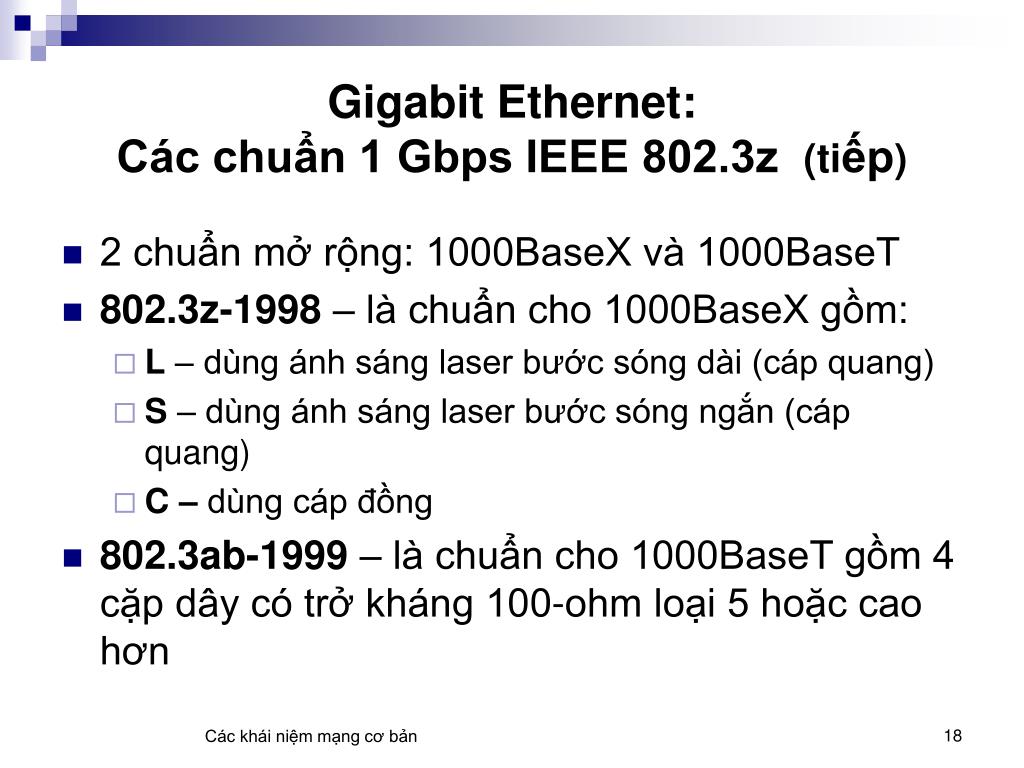 Gigabit Ethernet: Các chuẩn 1 Gbps IEEE 802.3z (tiếp) • 2 chuẩn mở rộng: 1000BaseX và 1000BaseT • 802.3z-1998 – là chuẩn cho 1000BaseX gồm: • L – dùng ánh sáng laser bước sóng dài (cáp quang) • S – dùng ánh sáng laser bước sóng ngắn (cáp quang) • C – dùng cáp đồng • 802.3ab-1999 – là chuẩn cho 1000BaseT gồm 4 cặp dây có trở kháng 100-ohm loại 5 hoặc cao hơn Các khái niệm mạng cơ bản