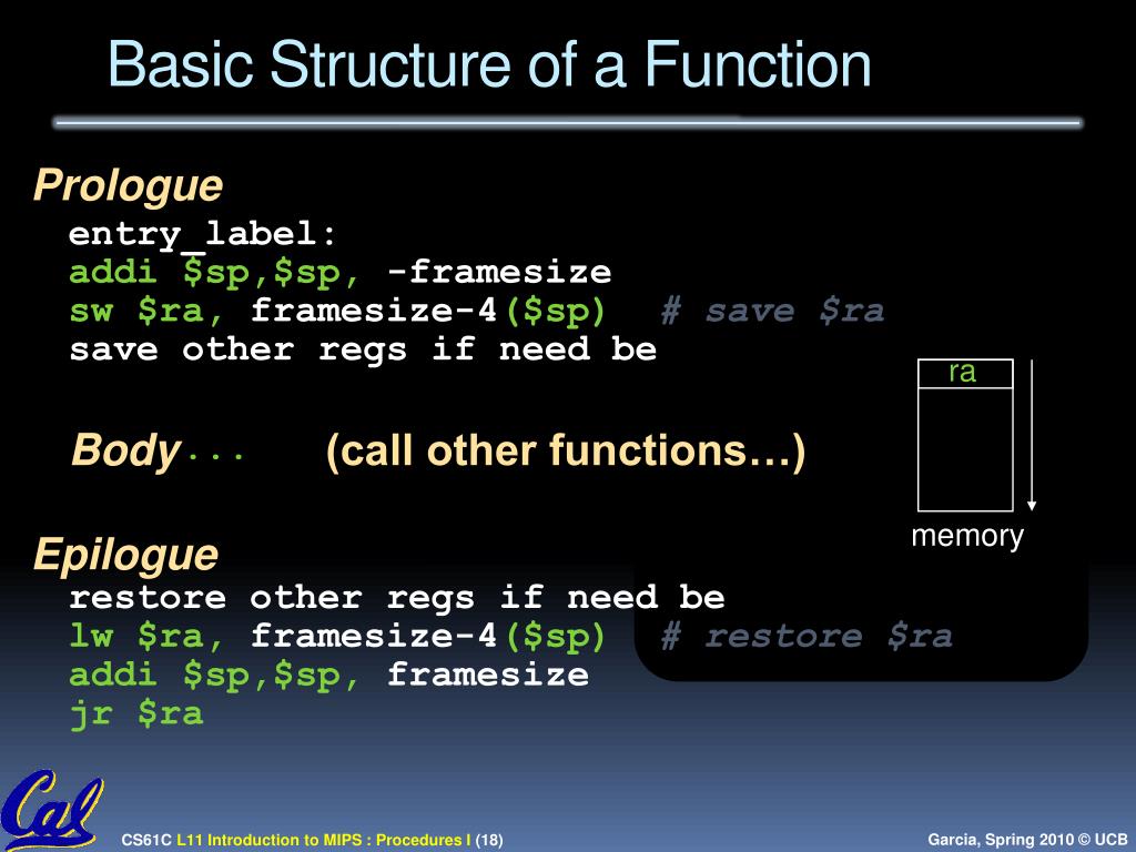 Basic Structure of a Function entry_label:addi $sp,$sp, -framesizesw $ra, framesize-4($sp) # save $rasave other regs if need be ... restore other regs if need belw $ra, framesize-4($sp) # restore $raaddi $sp,$sp,framesizejr $ra Prologue ra Body (call other functions…) memory Epilogue