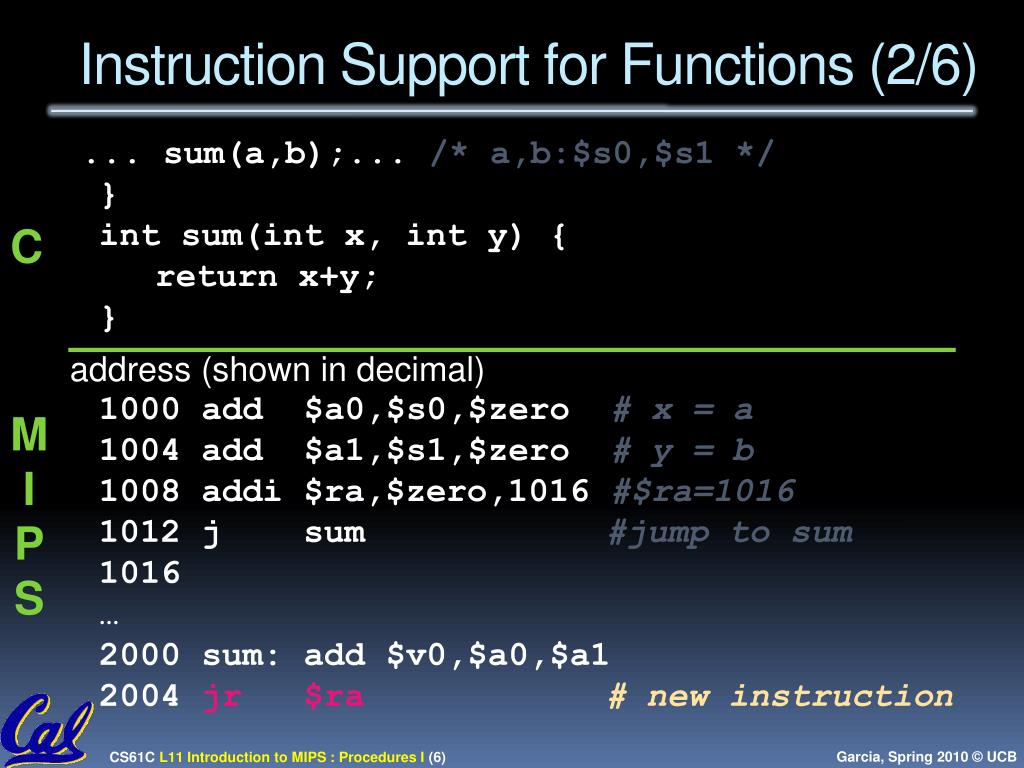 Instruction Support for Functions (1/6) ... sum(a,b);... /* a,b:$s0,$s1 */}intsum(intx, inty) { return x+y;} address (shown in decimal)1000 1004 1008 1012 1016 …2000 2004 C MIPS In MIPS, all instructions are 4 bytes, and stored in memory just like data. So here we show the addresses of where the programs are stored.