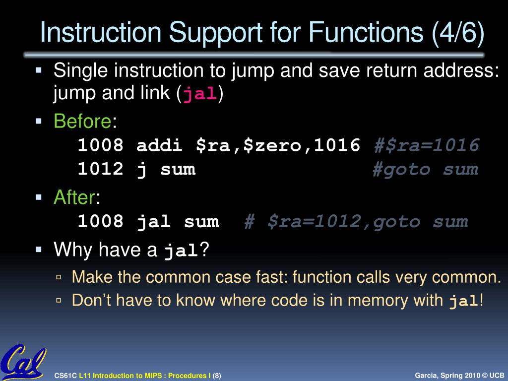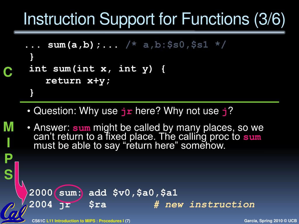 Instruction Support for Functions (4/6) • Single instruction to jump and save return address: jump and link (jal) • Before:1008 addi $ra,$zero,1016 #$ra=1016 1012 j sum #goto sum • After:1008 jal sum # $ra=1012,goto sum • Why have a jal? • Make the common case fast: function calls very common. • Don’t have to know where code is in memory with jal!