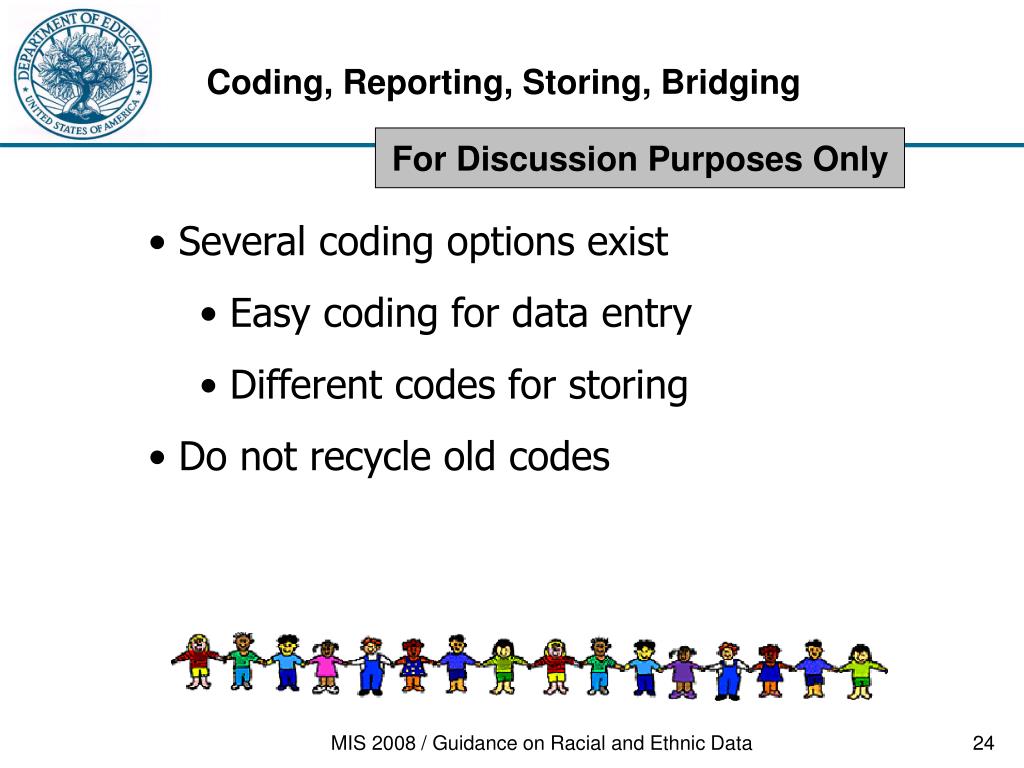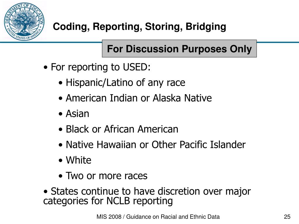Coding, Reporting, Storing, Bridging For Discussion Purposes Only • For reporting to USED: • Hispanic/Latino of any race • American Indian or Alaska Native • Asian • Black or African American • Native Hawaiian or Other Pacific Islander • White • Two or more races • States continue to have discretion over major categories for NCLB reporting