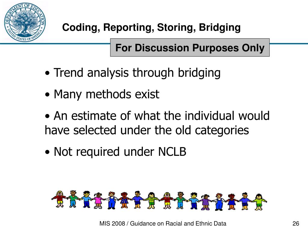 Coding, Reporting, Storing, Bridging For Discussion Purposes Only • Trend analysis through bridging • Many methods exist • An estimate of what the individual would have selected under the old categories • Not required under NCLB