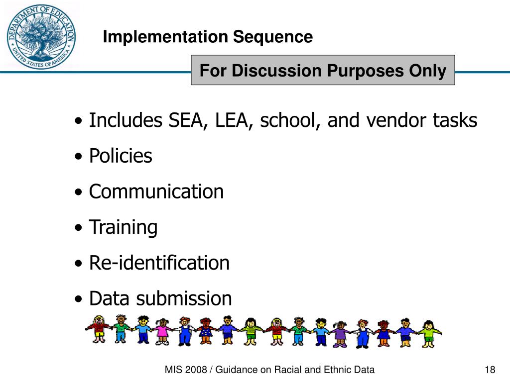 Implementation Sequence For Discussion Purposes Only • Includes SEA, LEA, school, and vendor tasks • Policies • Communication • Training • Re-identification • Data submission