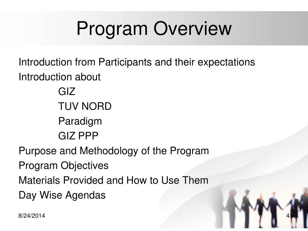 Program Overview Introduction from Participants and their expectations Introduction about GIZ TUV NORD Paradigm GIZ PPP Purpose and Methodology of the Program Program Objectives Materials Provided and How to Use Them Day Wise Agendas