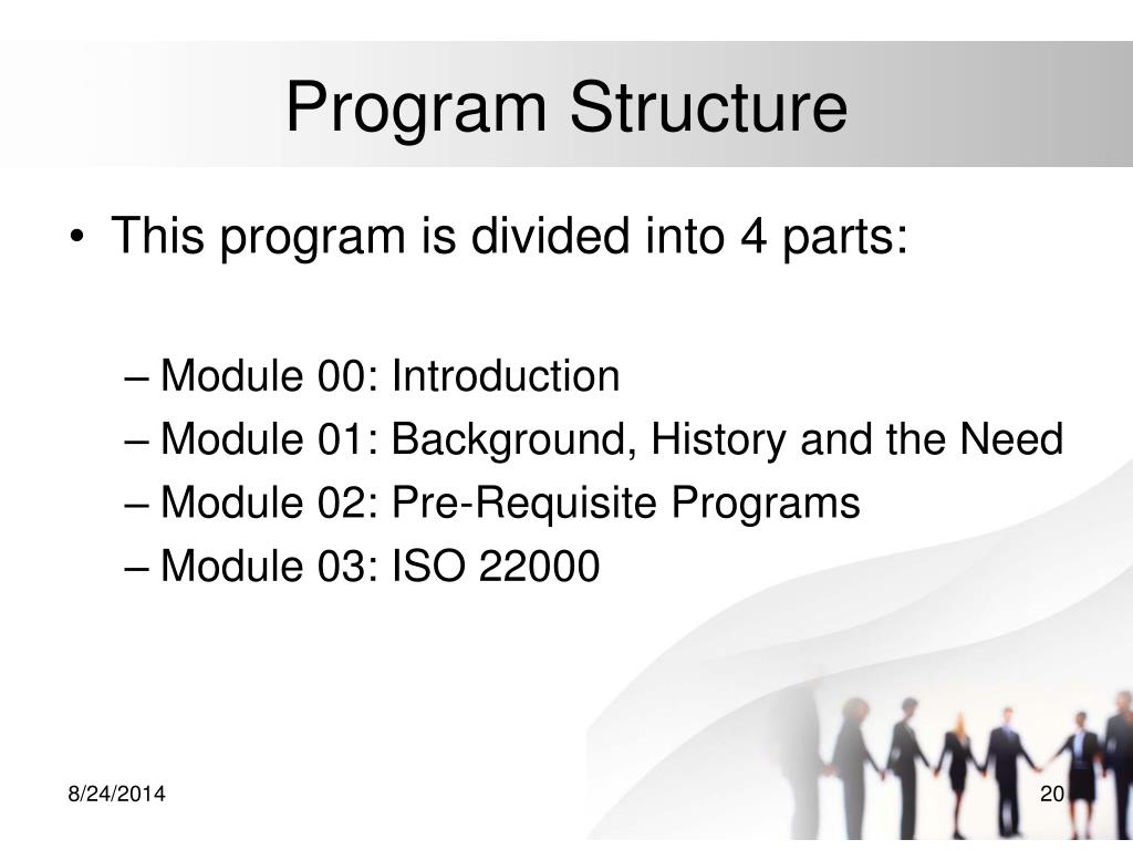 Program Structure • This program is divided into 4 parts: • Module 00: Introduction • Module 01: Background, History and the Need • Module 02: Pre-Requisite Programs • Module 03: ISO 22000