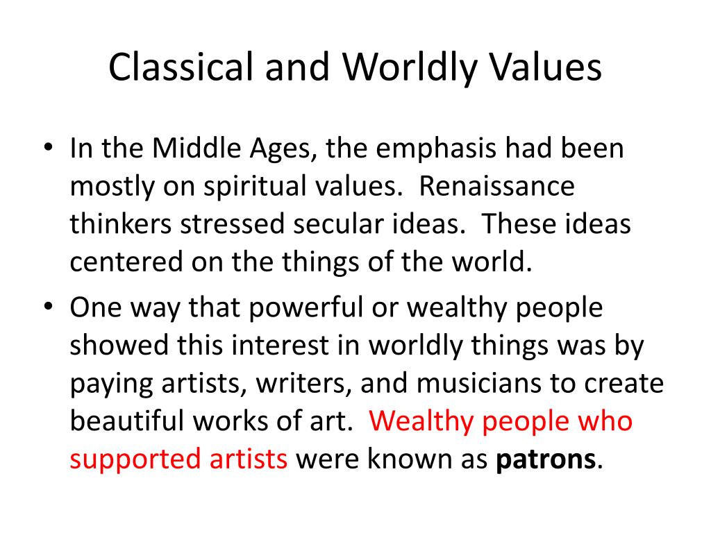 Classical and Worldly Values • In the Middle Ages, the emphasis had been mostly on spiritual values. Renaissance thinkers stressed secular ideas. These ideas centered on the things of the world. • One way that powerful or wealthy people showed this interest in worldly things was by paying artists, writers, and musicians to create beautiful works of art. Wealthy people who supported artists were known as patrons.