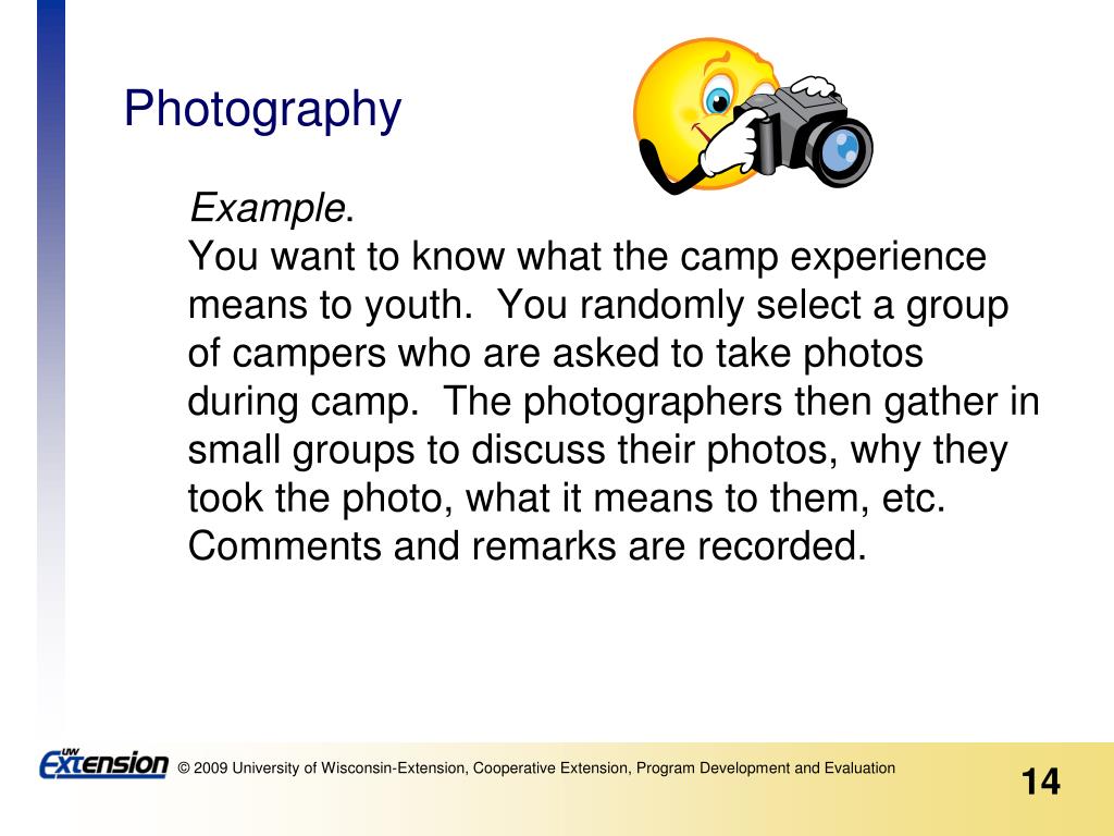 Photography Example. You want to know what the camp experience means to youth. You randomly select a group of campers who are asked to take photos during camp. The photographers then gather in small groups to discuss their photos, why they took the photo, what it means to them, etc. Comments and remarks are recorded.